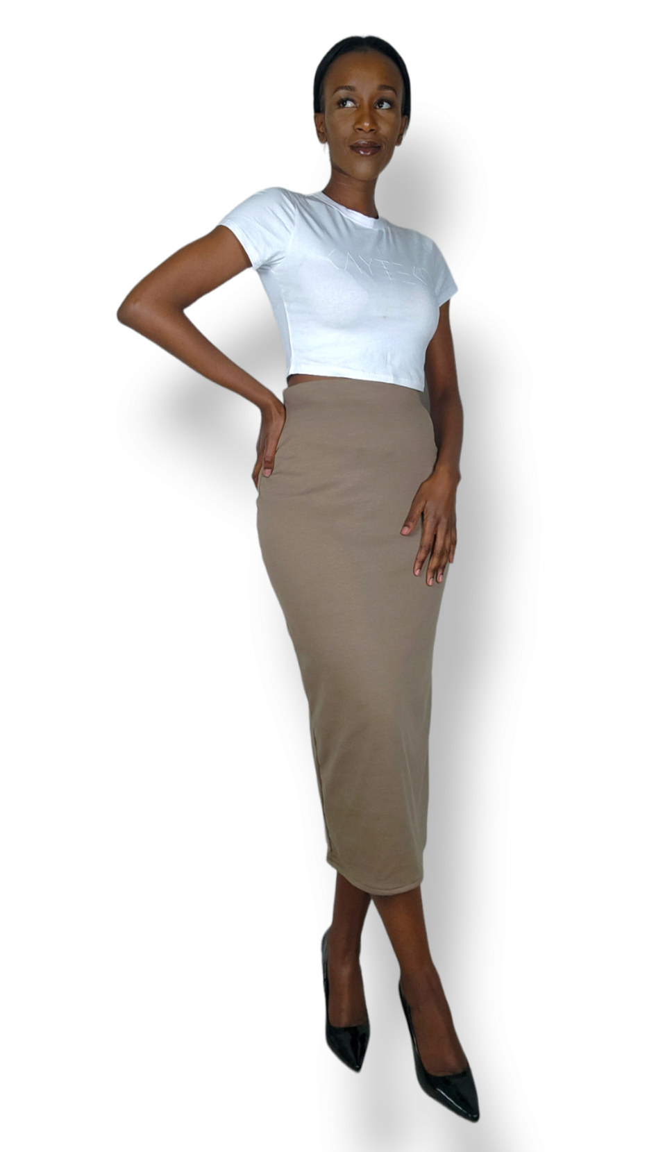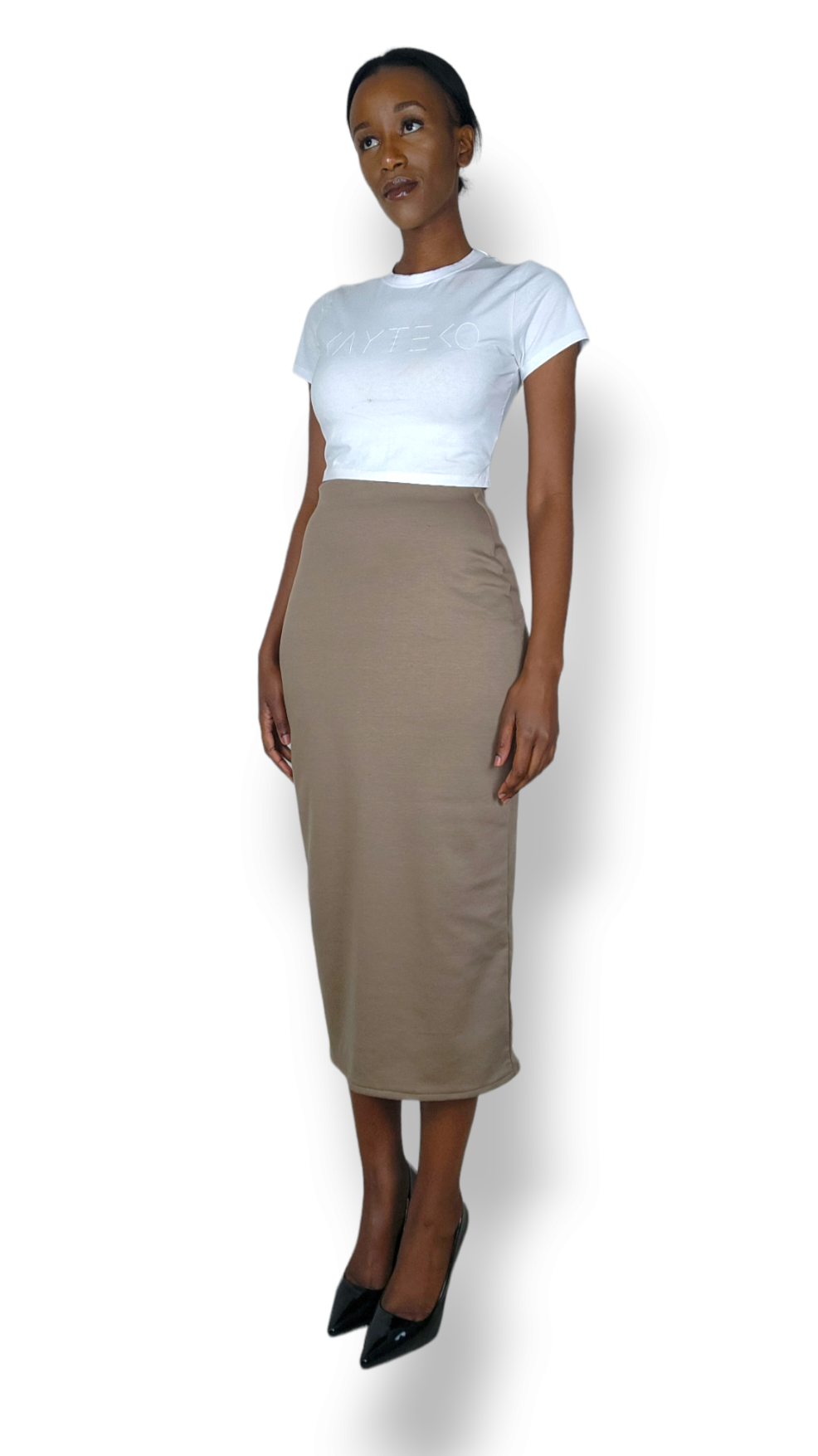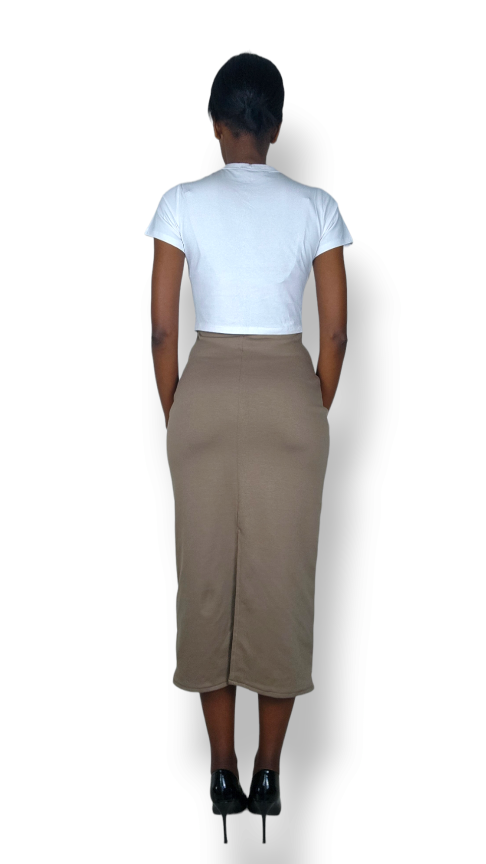 A comfortable, form-fitting midi skirt that you can dress up and down.